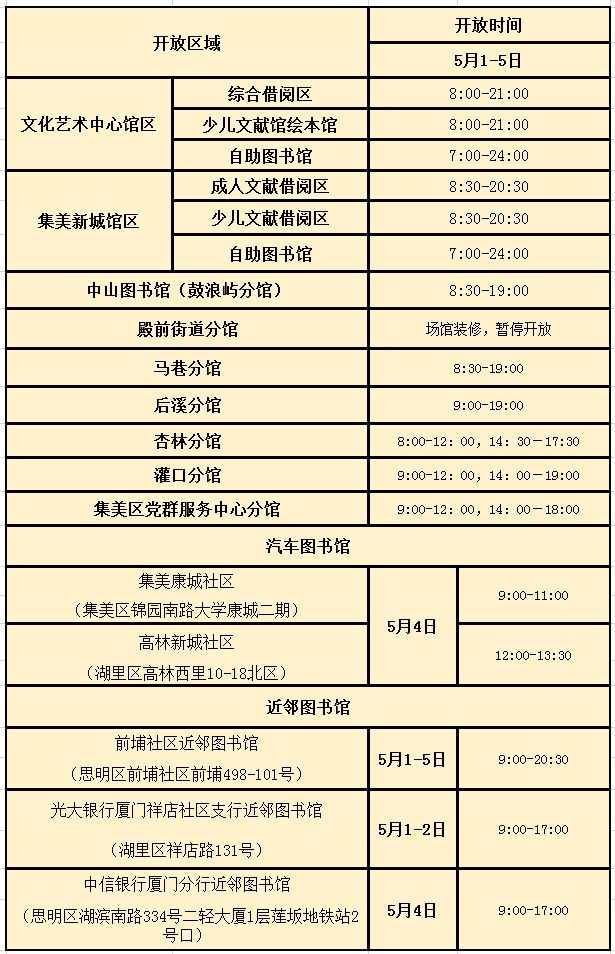 2024年五一勞動節(jié)假期(5月1日至5月5日),廈門市圖書館各館區(qū)、部分分館具體開放時間如下: