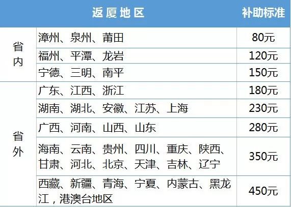 采取“定點(diǎn)定額”的補(bǔ)助方式。即按照返廈地點(diǎn)遠(yuǎn)近,按福建省內(nèi)3檔、外省5檔,共8檔次標(biāo)準(zhǔn),給予最低80元、最高450元的定額返程交通補(bǔ)助。