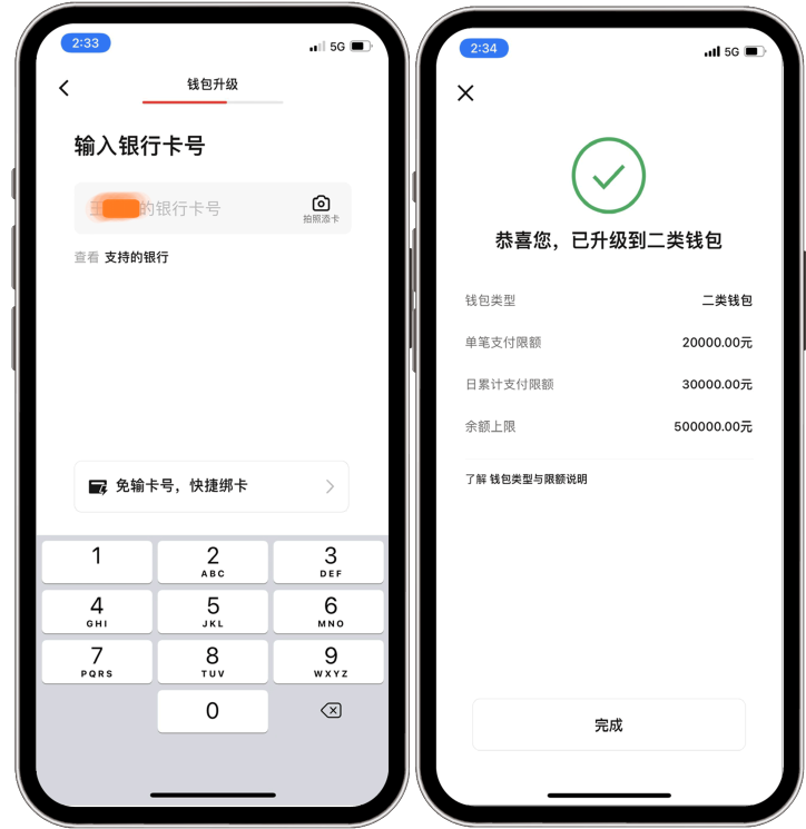 ?、掭斎脬y行卡號(hào),完成錢(qián)包升級(jí)。