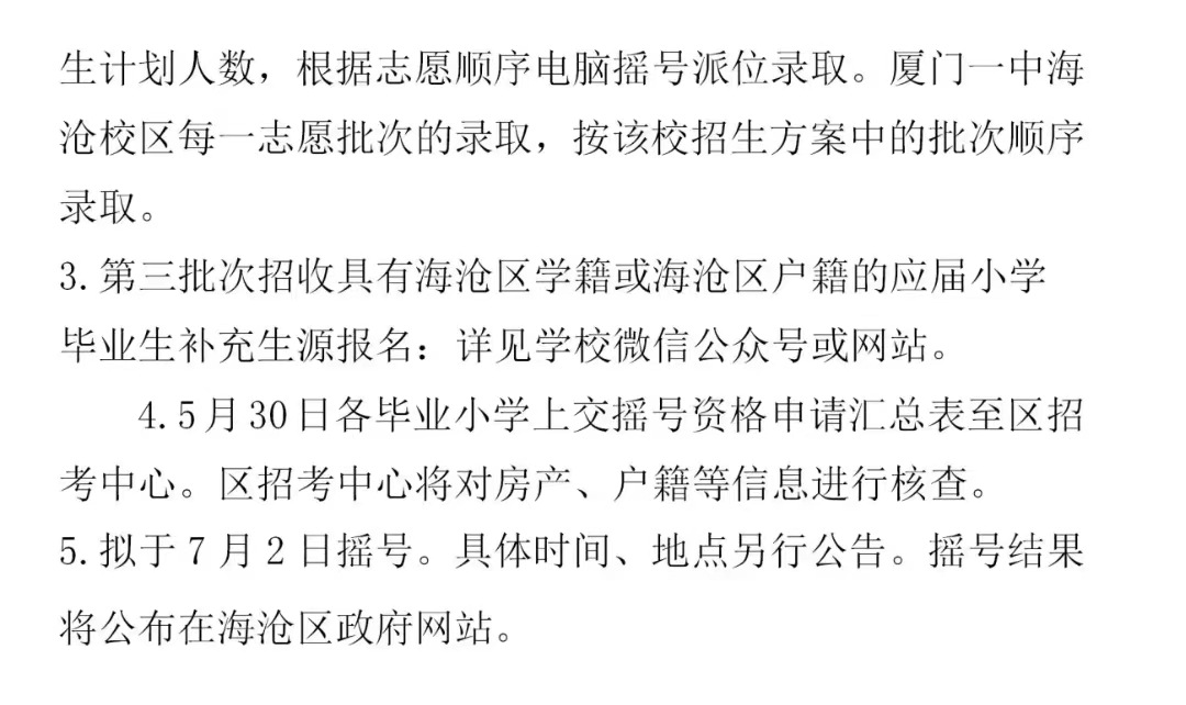 第3批次:第2批次錄取結(jié)束,如有剩余學(xué)位,招收部分具有海滄區(qū)學(xué)籍或海滄區(qū)戶籍的應(yīng)屆小學(xué)畢業(yè)生補(bǔ)充生源,不超過(guò)100人。具體招生辦法,由學(xué)校按照有關(guān)文件精神根據(jù)學(xué)校辦學(xué)需要制定招生方案,報(bào)市、區(qū)教育主管部門審核備案后實(shí)施。招生方案詳見(jiàn)學(xué)校微信公眾號(hào)或網(wǎng)站。