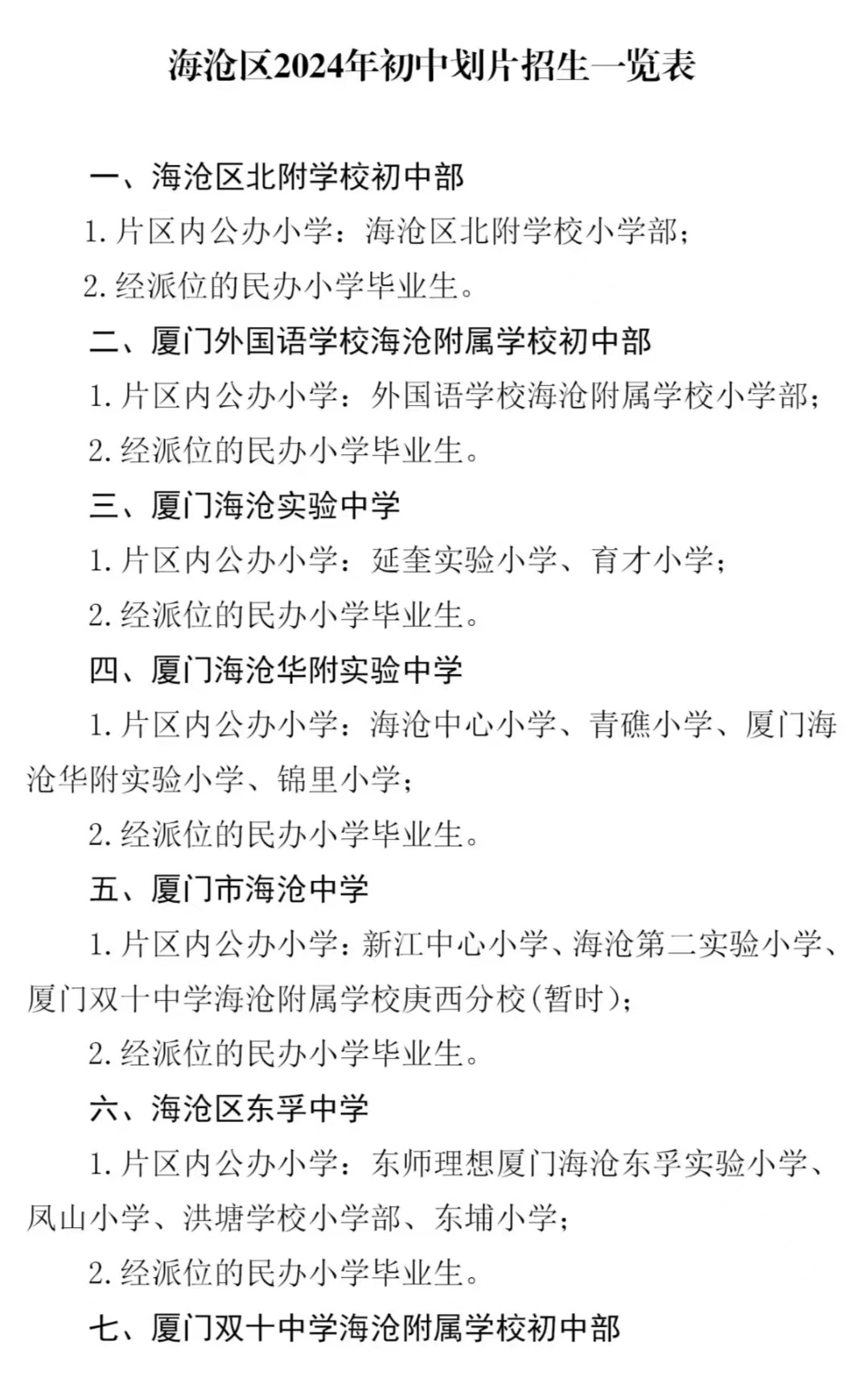 2.其他中學(xué)招生。各初中招生劃片以學(xué)生就讀的小學(xué)或以學(xué)生戶籍所在地為依據(jù)進(jìn)行錄?。ㄕ猩瑓^(qū)詳見(jiàn)附件2)。各初中優(yōu)先接收片區(qū)內(nèi)公辦小學(xué)畢業(yè)生。因南島學(xué)校(在建工程項(xiàng)目名)正在建設(shè)中,雙十海滄附校庚西分校2024年的小學(xué)畢業(yè)生暫劃入蕓景實(shí)驗(yàn)中學(xué)、海滄中學(xué)招生片區(qū)。根據(jù)填報(bào)志愿進(jìn)行錄取。