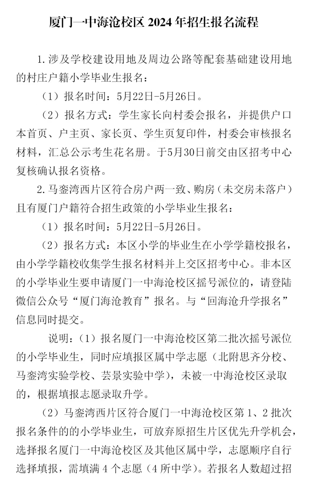 廈門一中海滄校區(qū)2024年招生報(bào)名流程