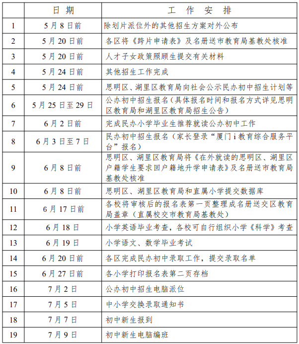 剛剛,廈門市教育局公布《廈門市2022年小學畢業(yè)和初中招生工作意見》,即小升初方案,和往年一樣,今天除了公布全市政策外,還公布了思明區(qū)和湖里區(qū)具體劃片方案,其他區(qū)將由各區(qū)教育局公布,那么今年廈門小升初派位時間是什么時候呢?