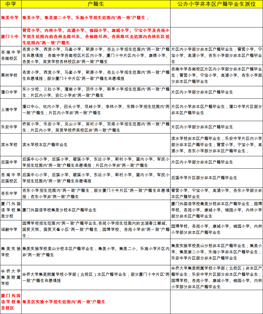 集美區(qū)2022初中招生劃片(校)、派位一覽表