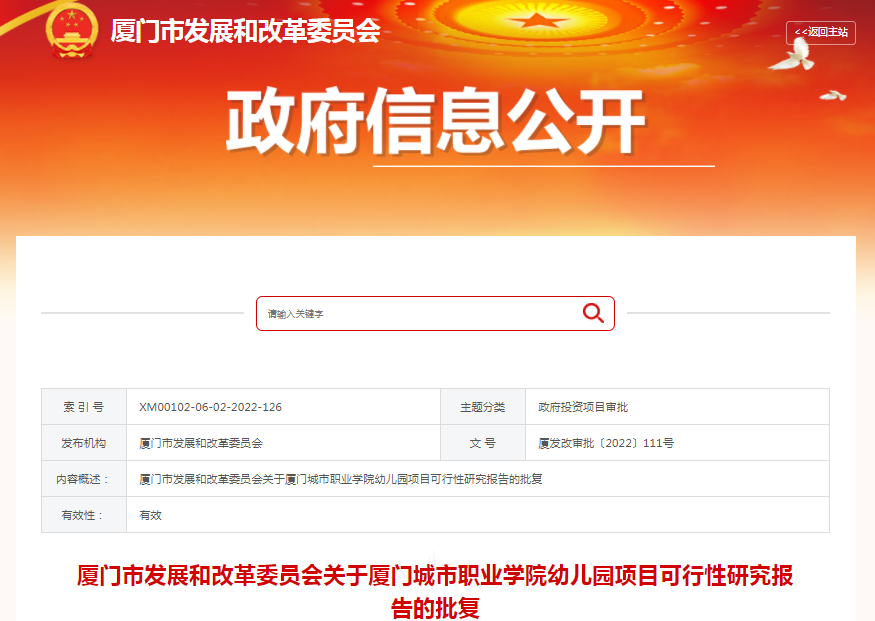 近日,廈門市發(fā)展和改革委員會發(fā)布關(guān)于廈門城市職業(yè)學(xué)院幼兒園項目可行性研究報告的批復(fù),同意建設(shè)廈門城市職業(yè)學(xué)院幼兒園項目。