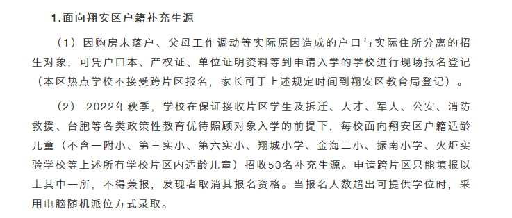 注意,片區(qū)招生對(duì)象必須符合“兩一致”,即適齡兒童與父母或者父母一方戶口一致,實(shí)際居住地與戶籍所在地一致(指適齡兒童及其家長(zhǎng)在其戶口簿記載的住址與實(shí)際住所一致)。此外,招生方案提到,學(xué)校將面向翔安區(qū)戶籍補(bǔ)充生源。