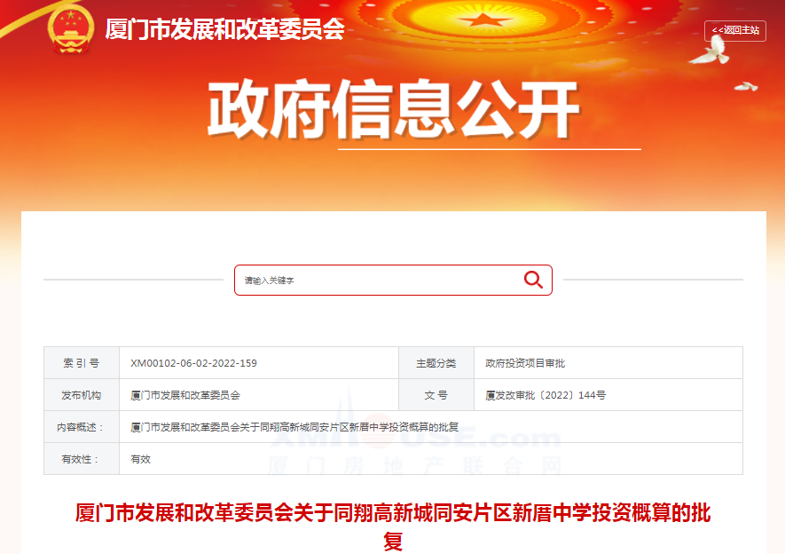 剛剛,廈門市發(fā)展和改革委員會發(fā)布關(guān)于同翔高新城同安片區(qū)新厝中學(xué)投資概算的批復(fù),同意批準(zhǔn)同翔高新城同安片區(qū)新厝中學(xué) 投資概算。
