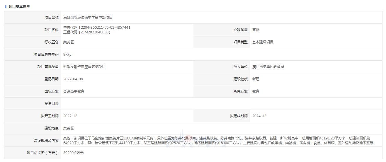 今年4月,該項(xiàng)目報(bào)建信息公布,報(bào)建表顯示,項(xiàng)目計(jì)劃今年12月開工,預(yù)計(jì)2024年12月建成。