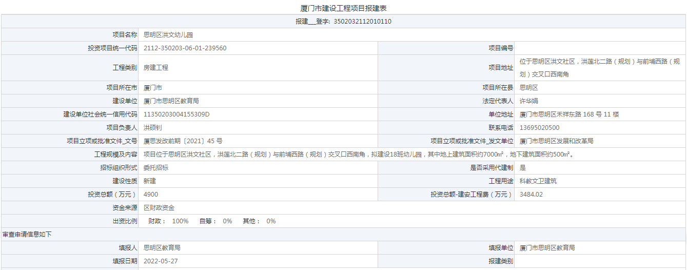 今年5月,思明區(qū)洪文幼兒園項目最新報建信息公布。