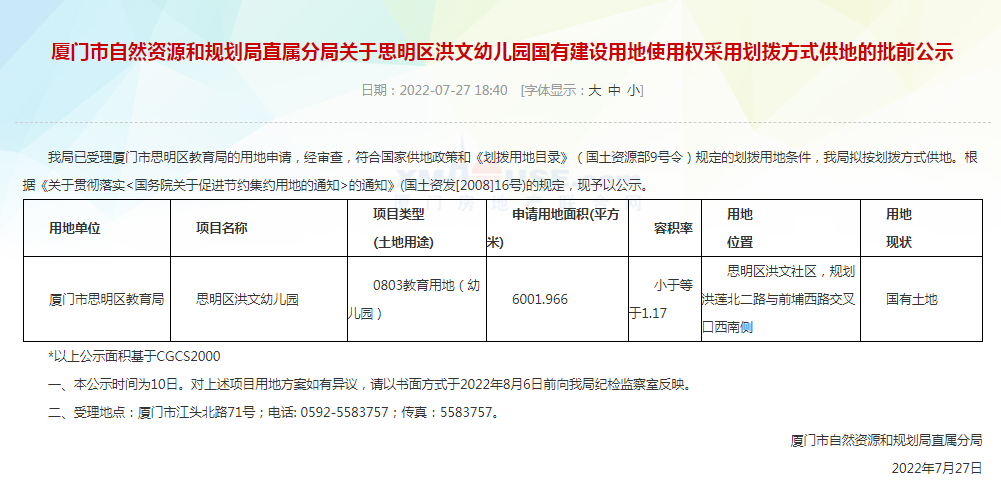 近日,廈門市自然資源和規(guī)劃局直屬分局發(fā)布關(guān)于思明區(qū)洪文幼兒園國有建設(shè)用地使用權(quán)采用劃撥方式供地的批前公示。