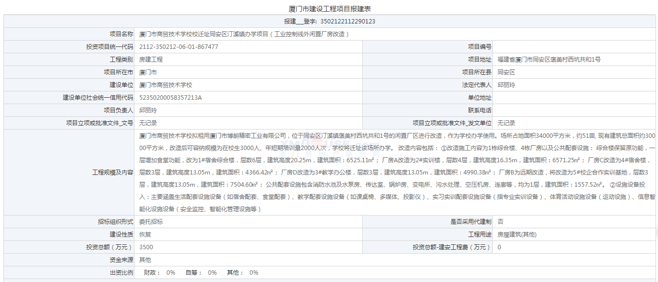 近日,廈門市商貿(mào)技術(shù)學(xué)校校遷址同安區(qū)汀溪鎮(zhèn)辦學(xué)項(xiàng)目(工業(yè)控制線外閑置廠房改造)報(bào)建信息公布。