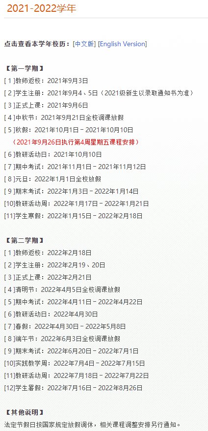 第一學期(共19周):2021年9月4日—2022年1月14日