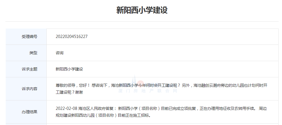 對此, 海滄區(qū)人民政府答復(fù):新陽西小學(xué)(項目名稱)目前已完成立項批復(fù),正在辦理用地征收及農(nóng)轉(zhuǎn)用手續(xù)。 周邊規(guī)劃建設(shè)新陽西幼兒園(項目名稱)目前正在施工招標。