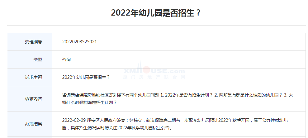 對(duì)此, 翔安區(qū)人民政府答復(fù):經(jīng)核實(shí),新店保障房二期有一所配套幼兒園預(yù)計(jì)2022年秋季開園,屬于公辦性質(zhì)幼兒園,具體招生情況屆時(shí)請(qǐng)關(guān)注2022年秋季幼兒園招生公告。