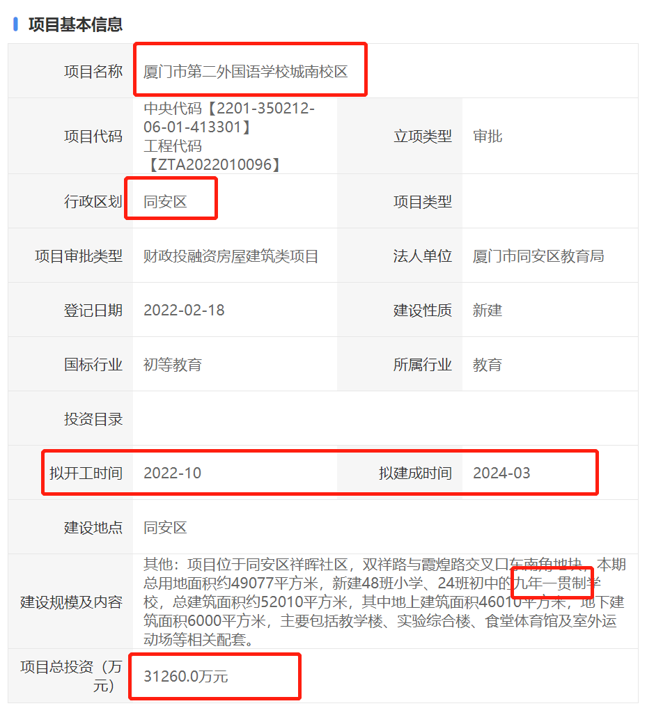 事實(shí)上,在2021年12月20日,同安區(qū)政府發(fā)布廈門市屬火炬高新實(shí)驗(yàn)學(xué)校項(xiàng)目征收土地預(yù)公告,確定項(xiàng)目土地征收范圍位于同安區(qū)大同街道東宅村,用于廈門市屬火炬高新實(shí)驗(yàn)學(xué)校項(xiàng)目建設(shè)。