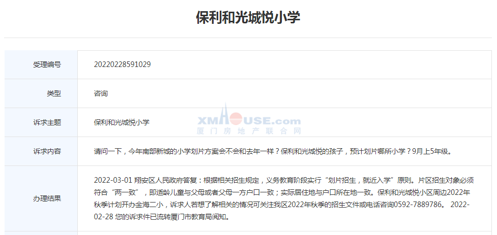對此, 翔安區(qū)人民政府答復(fù):根據(jù)相關(guān)招生規(guī)定,義務(wù)教育階段實行“劃片招生,就近入學(xué)”原則。片區(qū)招生對象必須符合“兩一致”,即適齡兒童與父母或者父母一方戶口一致;實際居住地與戶口所在地一致。保利和光城悅小區(qū)周邊2022年秋季計劃開辦金海二小,訴求人若想了解相關(guān)的情況可關(guān)注我區(qū)2022年秋季的招生文件或電話咨詢0592-7889786。