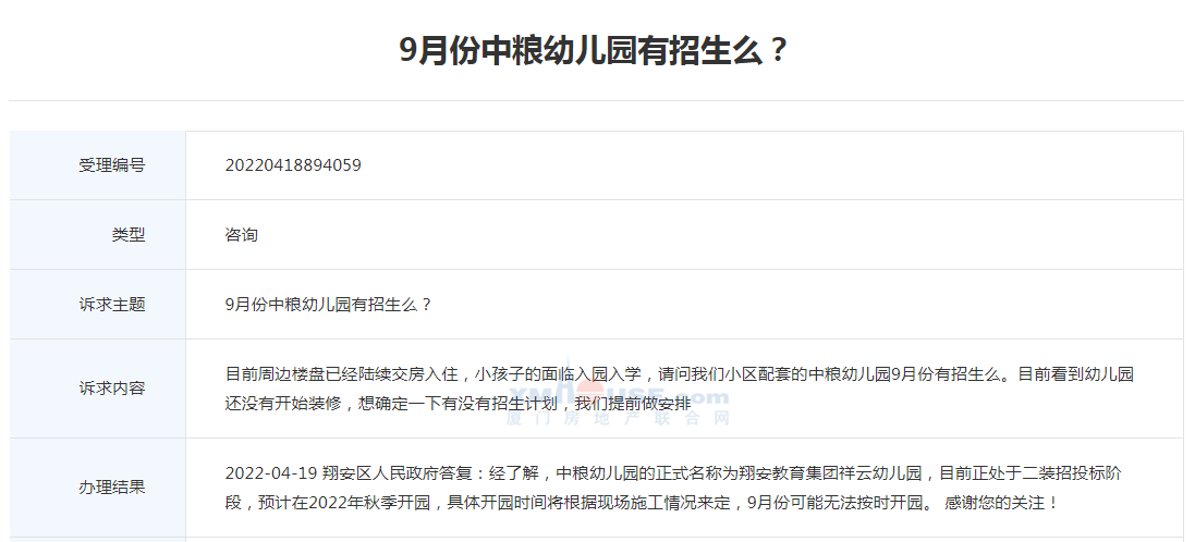 對此, 翔安區(qū)人民政府答復(fù):經(jīng)了解,中糧幼兒園的正式名稱為翔安教育集團(tuán)祥云幼兒園,目前正處于二裝招投標(biāo)階段,預(yù)計(jì)在2022年秋季開園,具體開園時間將根據(jù)現(xiàn)場施工情況來定,9月份可能無法按時開園。 感謝您的關(guān)注!