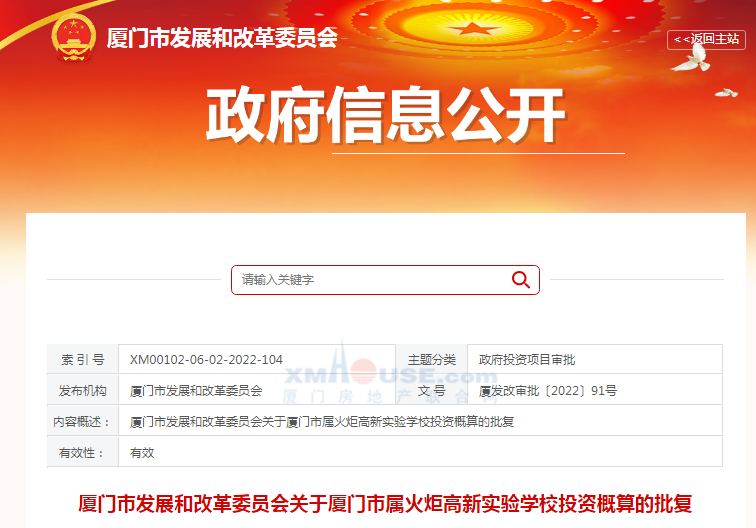 剛剛,廈門市發(fā)展和改革委員會發(fā)布關(guān)于廈門市屬火炬高新實(shí)驗(yàn)學(xué)校投資概算的批復(fù),同意批準(zhǔn)廈門市屬火炬高新實(shí)驗(yàn)學(xué)校投資概算。