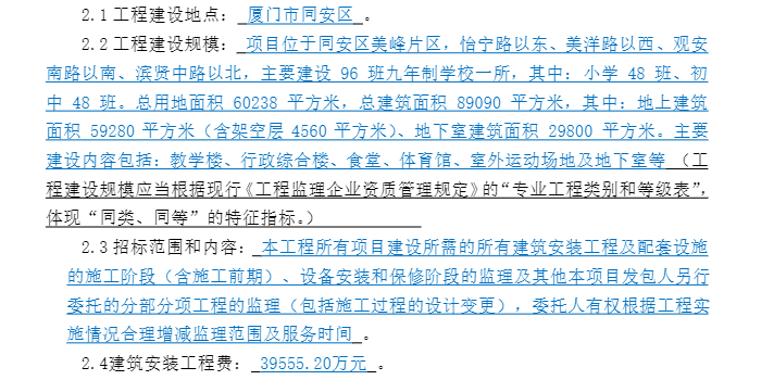 本項(xiàng)目已具備招標(biāo)條件,現(xiàn)對該項(xiàng)目的監(jiān)理進(jìn)行公開招標(biāo)。建筑安裝工程費(fèi):39555.20萬元。