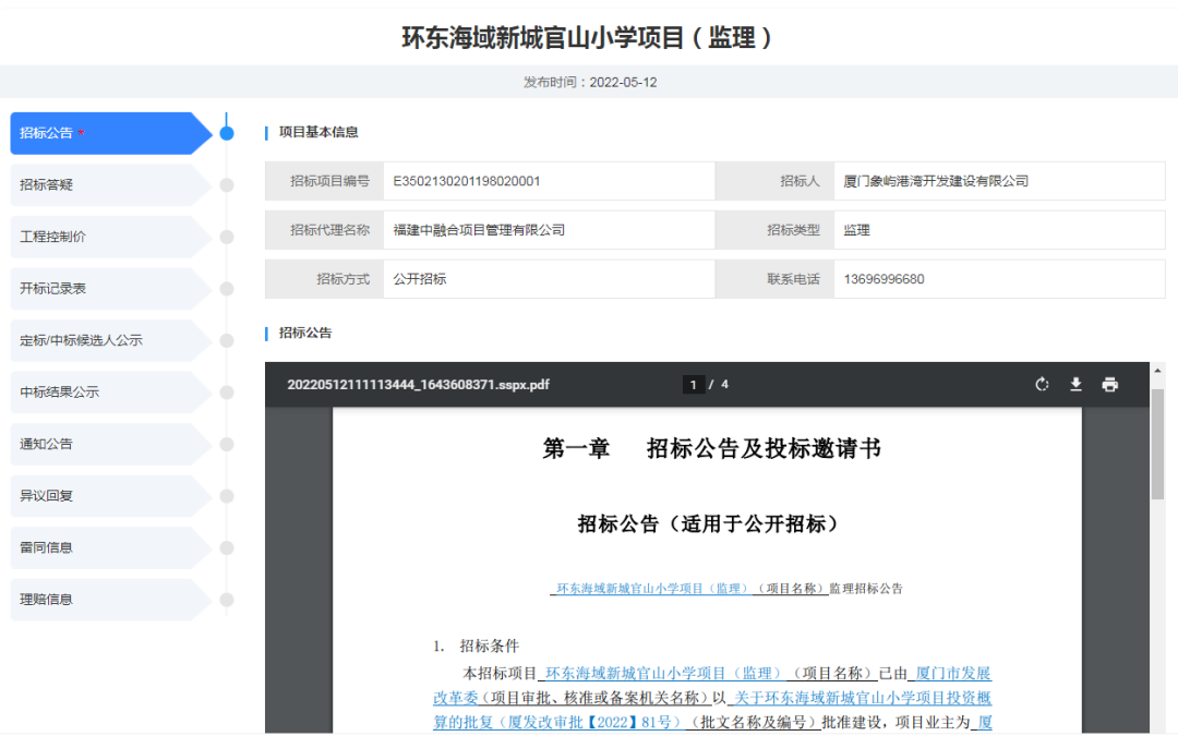另外,環(huán)東海域新城官山小學項目(監(jiān)理)也發(fā)布招標公告。