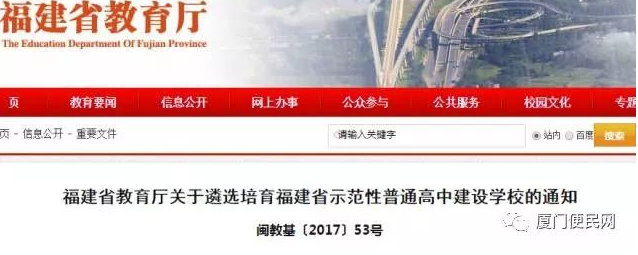 廈門便民網(wǎng)訊:昨天,省教育廳開始公示兩份名單:1.福建省示范性普通高中建設(shè)學(xué)校立項評估結(jié)果公示,2.省一級達標(biāo)高中首輪復(fù)查結(jié)果公示