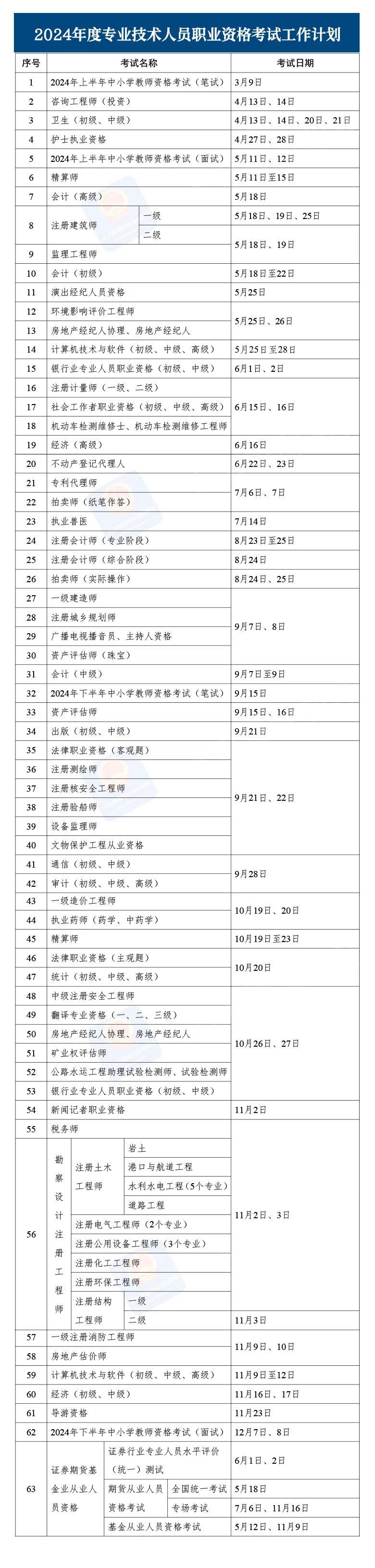 近日,人力資源社會(huì)保障部辦公廳印發(fā)《關(guān)于2024年度專業(yè)技術(shù)人員職業(yè)資格考試工作計(jì)劃及有關(guān)事項(xiàng)的通知》。大家關(guān)心的考試時(shí)間表定了!快收藏好!證券期貨基金業(yè)從業(yè)人員資格各次考試地點(diǎn)不同,精算師兩次考試科目不同,具體安排以相關(guān)行業(yè)協(xié)會(huì)考試公告為準(zhǔn)。如遇特殊情況需要變更考試日期的,將提前另行通知。