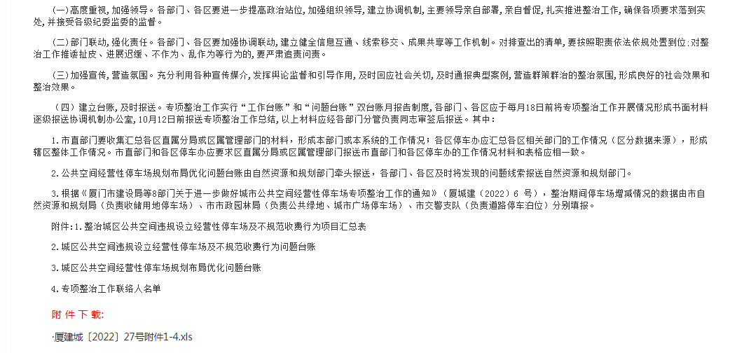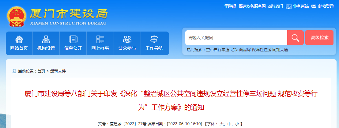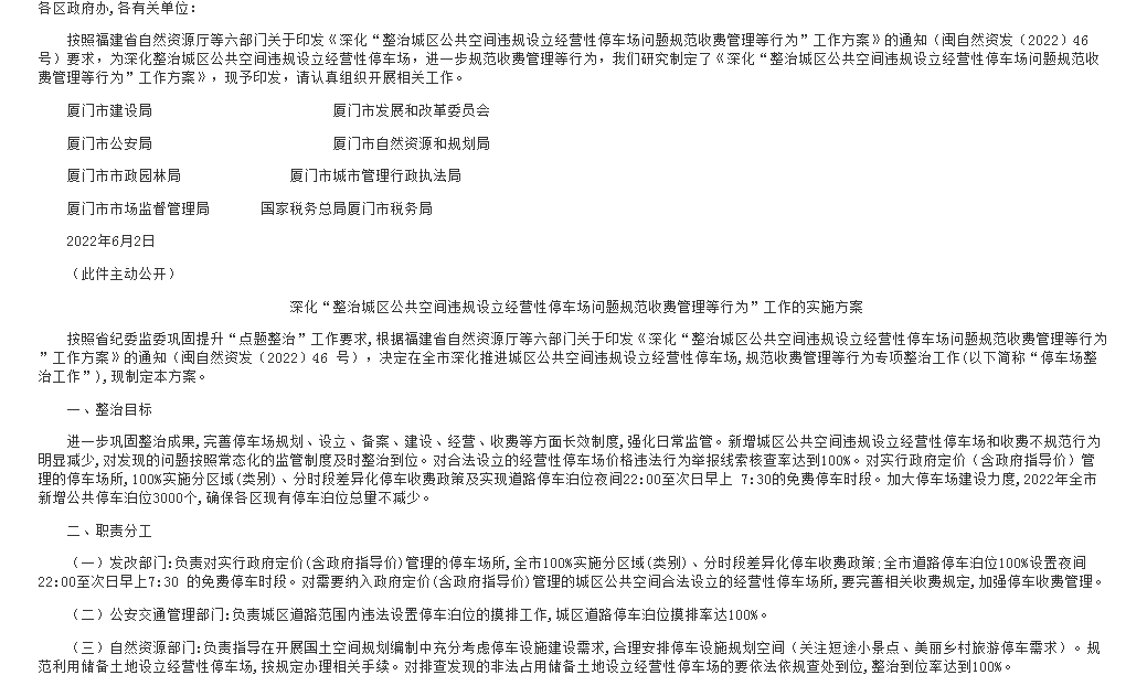 近日,廈門市建設(shè)局等八部門印發(fā)《深化“整治城區(qū)公共空間違規(guī)設(shè)立經(jīng)營性停車場問題 規(guī)范收費(fèi)等行為”工作方案》的通知。