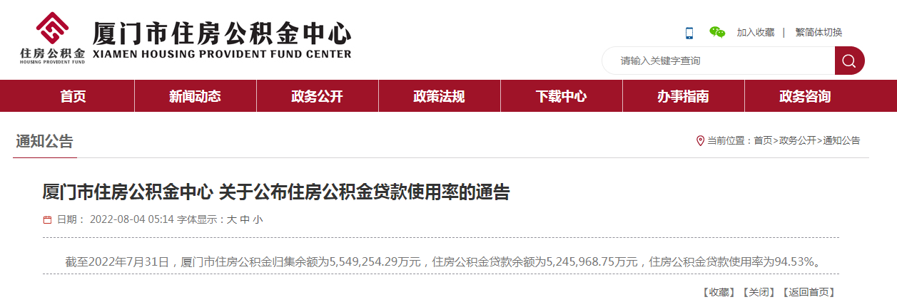 近日,廈門市住房公積金中心發(fā)布關(guān)于公布住房公積金貸款使用率的通告,截至2022年7月31日,廈門市住房公積金歸集余額為5,549,254.29萬元,住房公積金貸款余額為5,245,968.75萬元,住房公積金貸款使用率為94.53%。