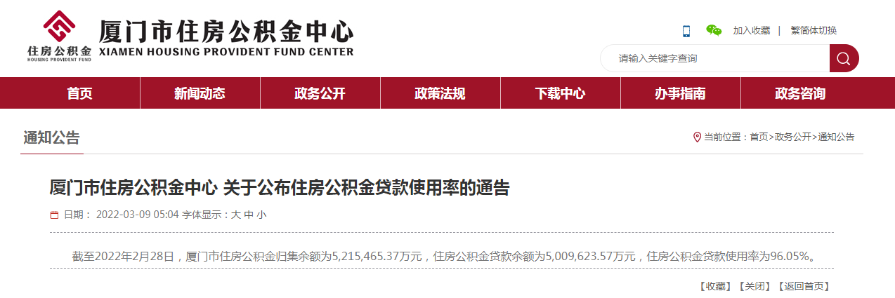 近日,廈門市住房公積金中心發(fā)布關(guān)于公布住房公積金貸款使用率的通告,截至2022年2月28日,廈門市住房公積金歸集余額為5,215,465.37萬元,住房公積金貸款余額為5,009,623.57萬元,住房公積金貸款使用率為96.05%。