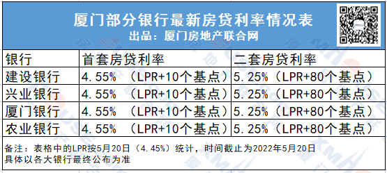 目前廈門首套房貸利率為4.55%(LPR+10bp),二套房貸利率為5.25%(LPR+80bp)。