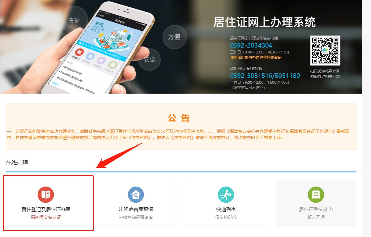 (1)登陸i廈門居住證網上辦理系統,點擊“暫住登記及居住證辦理”;