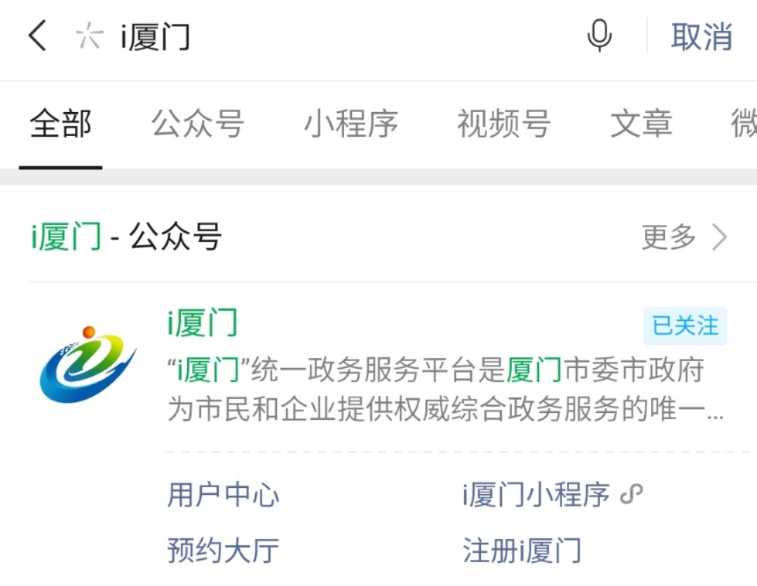 1、微信搜索“i廈門”公眾號(hào),然后點(diǎn)擊進(jìn)入并關(guān)注;