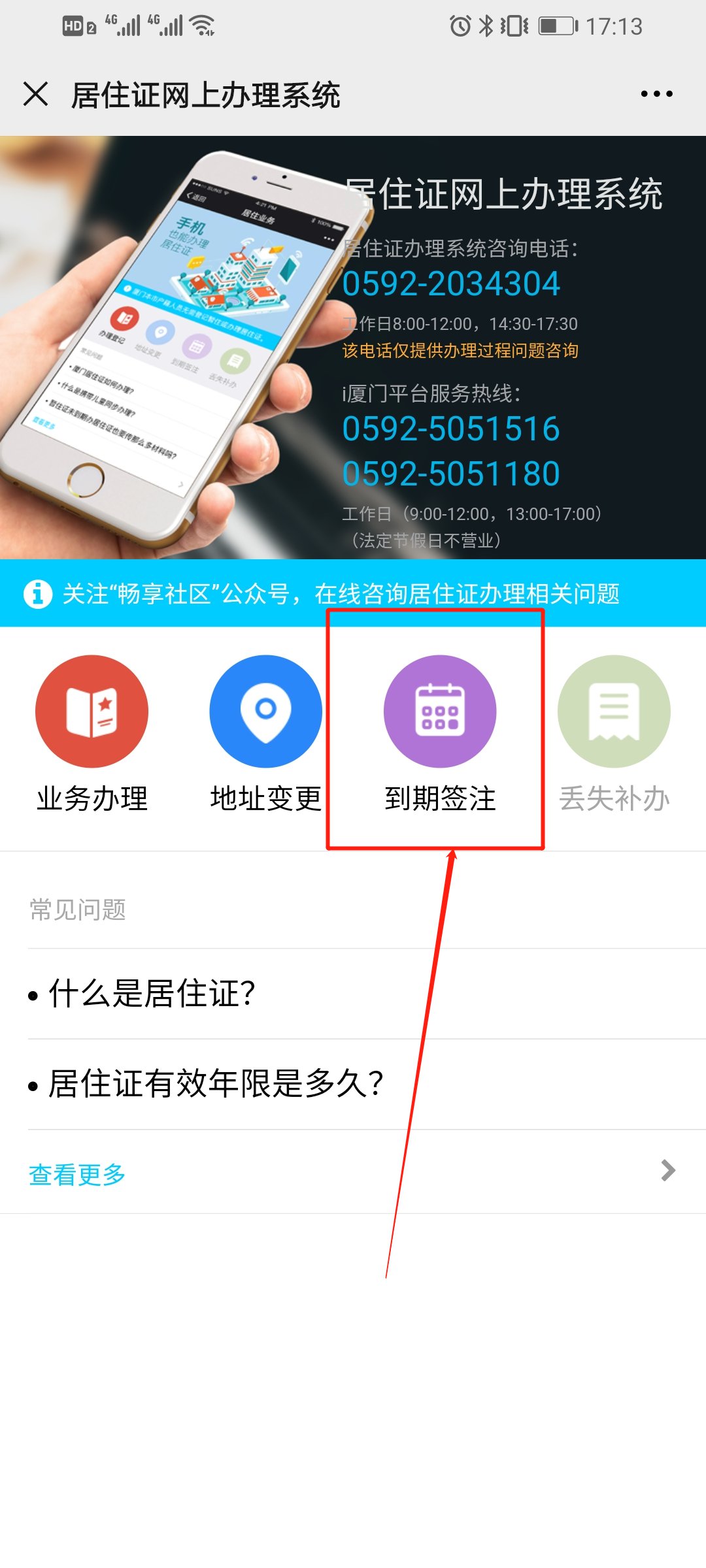 然后進入,點擊“到期簽注”即可進入辦理續(xù)簽申請。(注:審核通過后,需本人攜帶原居住證及審核通過的頁面截圖,到屬地派出所(或社區(qū))辦證點或e政務便民服務站進行居住證擦寫。)