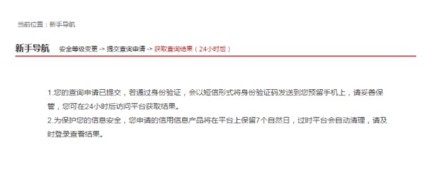 2.為保護您的信息安全,您申請的信用信息產(chǎn)品將在平臺上保留7個自然日,過時平臺會自動清理,請及時登錄查看結(jié)果。