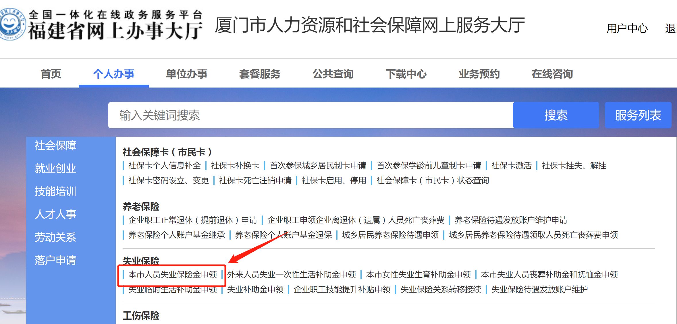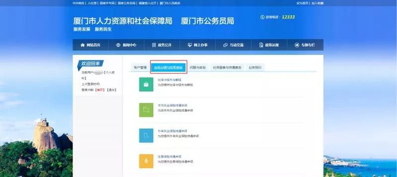 ?、龠M(jìn)入申請(qǐng)入口,登錄廈門市人社局門戶網(wǎng)站網(wǎng)上辦事大廳,點(diǎn)擊“網(wǎng)上辦事”;