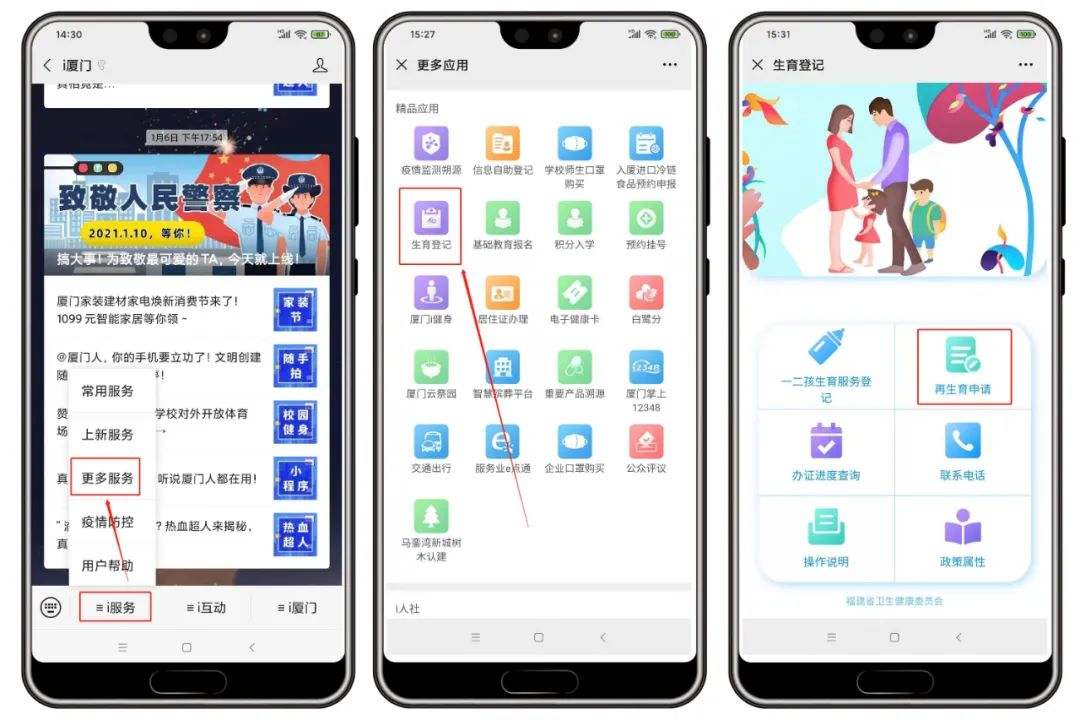 點擊菜單欄【i服務】-【更多服務】-【生育登記】-【再生育申請】,根據(jù)系統(tǒng)提示提交相關資料