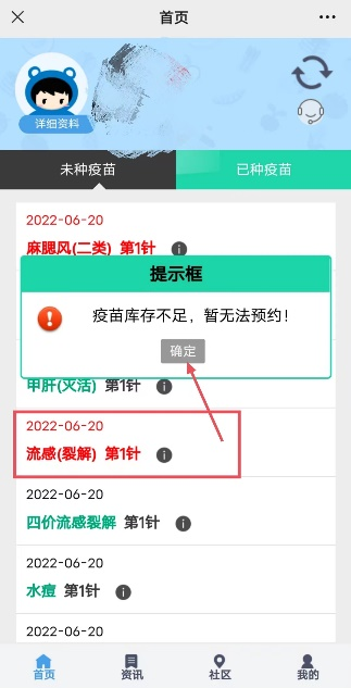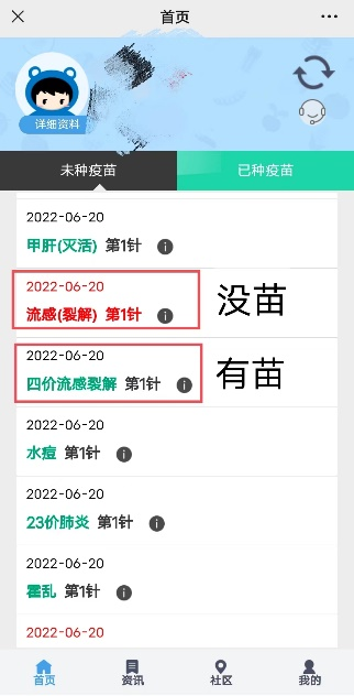 4、注冊登錄成功后,就進入到疫苗界面了。在“未種疫苗—非免疫規(guī)劃疫苗欄”找到流感疫苗(流感裂解指的就是三價滅活流感疫苗)