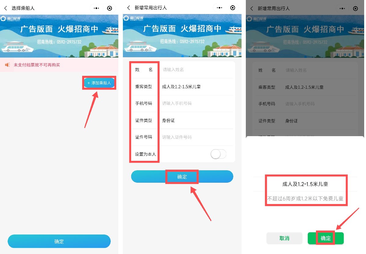 4. 點擊“添加乘船人”添加乘船人員信息。6周歲以下或1.2米以下兒童可享受免費票,游客類型選擇為“免費兒童”,并填寫乘船人信息,點擊“確定”后,勾選乘船人。