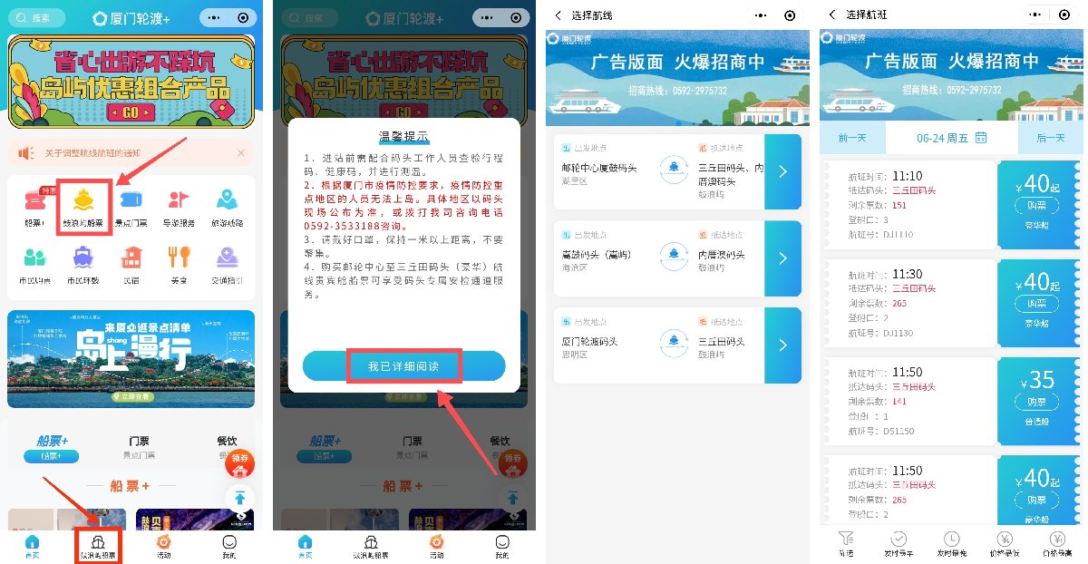 3. 返回首頁,點擊“鼓浪嶼船票”,詳細閱讀“溫馨提示”后點擊“我已詳細閱讀”,選擇乘船航線后,選擇航班日期及乘船時間,航班可按所需條件進行篩選。