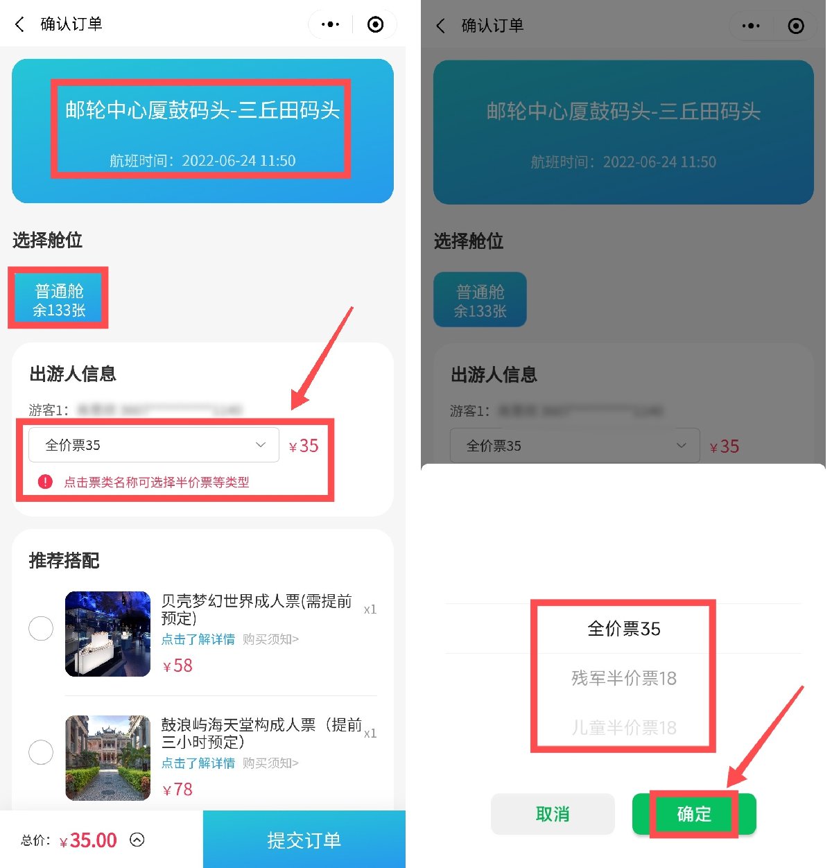 5. 確認訂單信息“航線”“航班時間”“艙位類型”“乘客信息”,默認為全價票,點擊“全價票”可更改票價“兒童半價票”“殘軍半價票”“兒童免費票”。