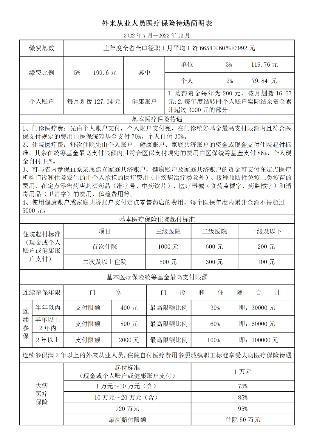外來(lái)從業(yè)人員醫(yī)療保險(xiǎn)待遇簡(jiǎn)明表(2022年7月-2022年12月)