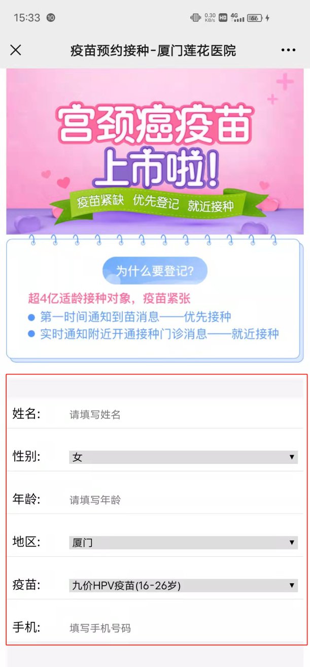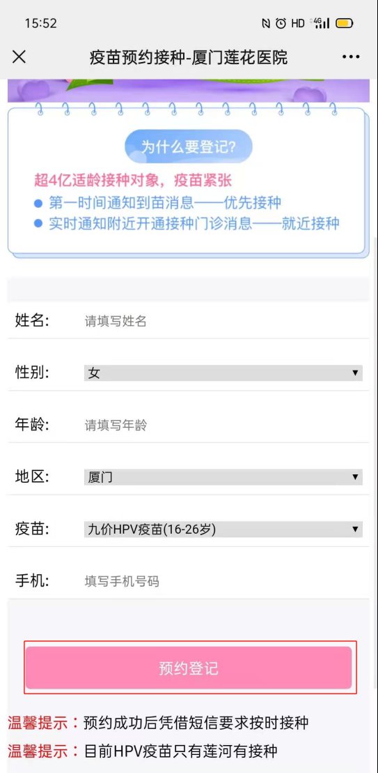 打開疫苗預(yù)約接種頁面,填寫預(yù)約者個人基本信息,在“疫苗”一欄選擇“九價HPV疫苗(16-26歲)”