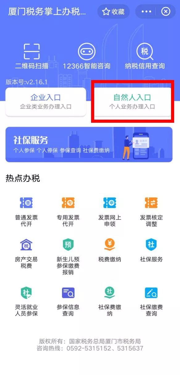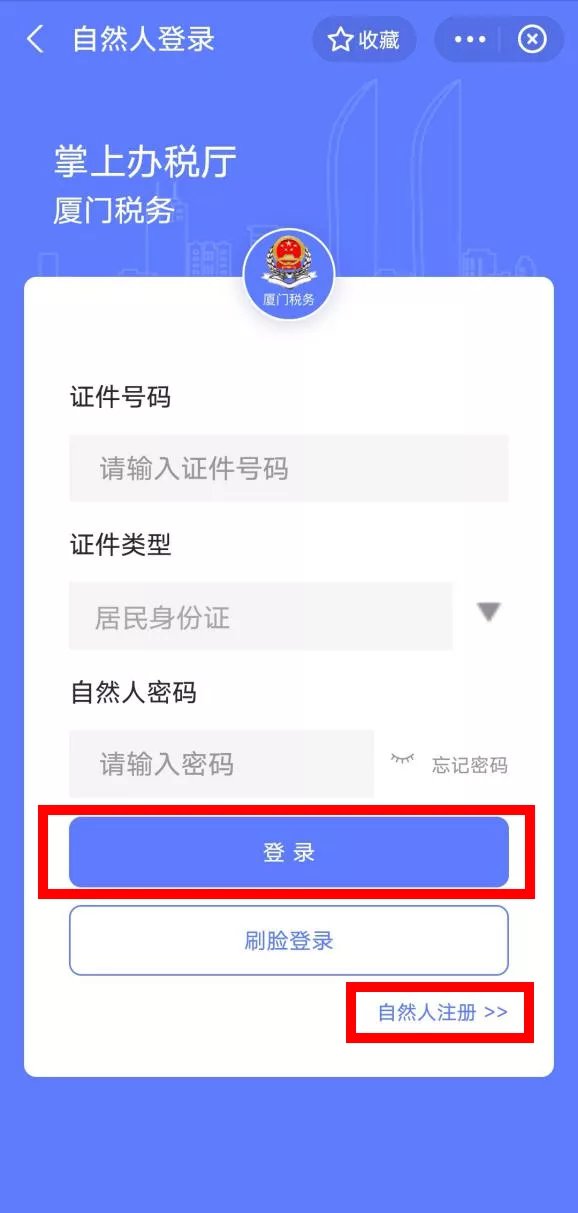如果沒有注冊過廈門稅務掌上辦稅廳自然人賬號的,請點擊【自然人注冊】進行賬號注冊。