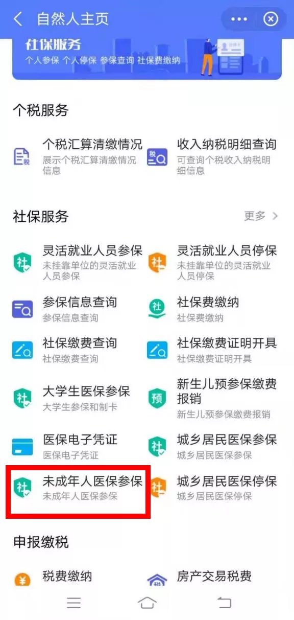 ?、弁瓿沈炞C后點擊【社保服務】下的【未成年人醫(yī)保參?!浚M入“參保登記”步驟。