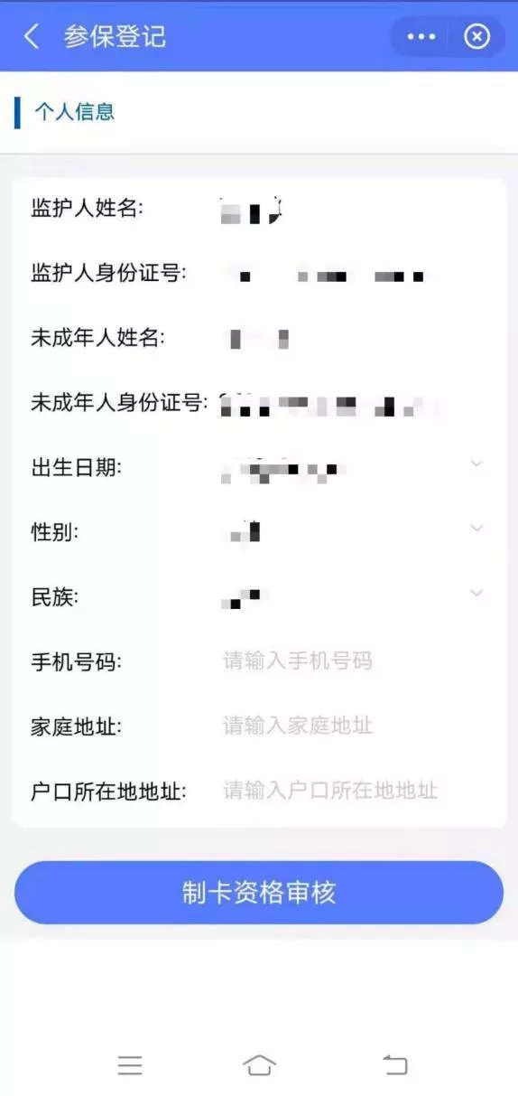 ?、馨匆筇顚懴嚓P信息后,點擊【下一步】進入“社保制卡資格審查”步驟,核對已有的“監(jiān)護人姓名”、“監(jiān)護人身份證號”、“未成年人姓名”等信息,并填寫“手機號碼”、“家庭住址”、“戶口所在地地址”等信息即完成未成年人醫(yī)療保險參保。