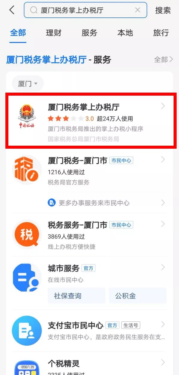 ①打開支付寶APP,首頁搜索“廈門稅務掌上辦稅廳”,進入小程序。