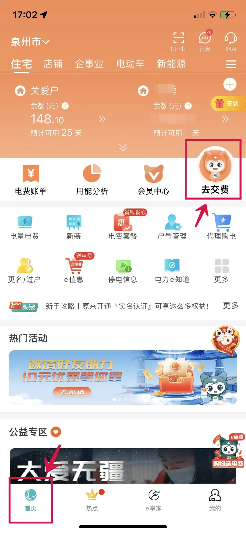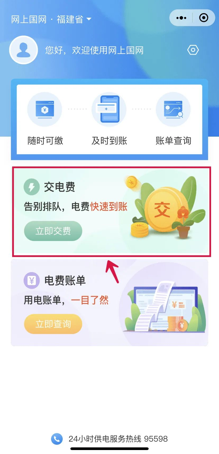 操作流程:前往網(wǎng)上國網(wǎng)App【首頁】-【去交費】,可以為已綁定戶號交費,支持多戶、跨省交費。