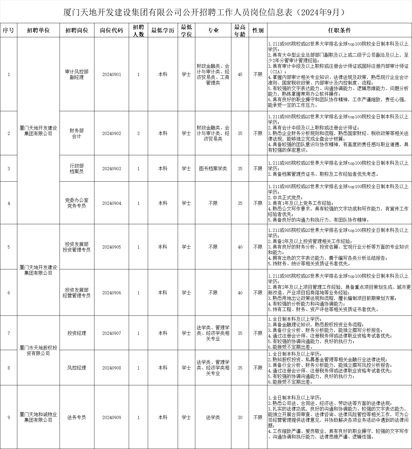 - 附件1:廈門天地開發(fā)建設(shè)集團有限公司公開招聘工作人員崗位信息表(2024年9月).xlsx