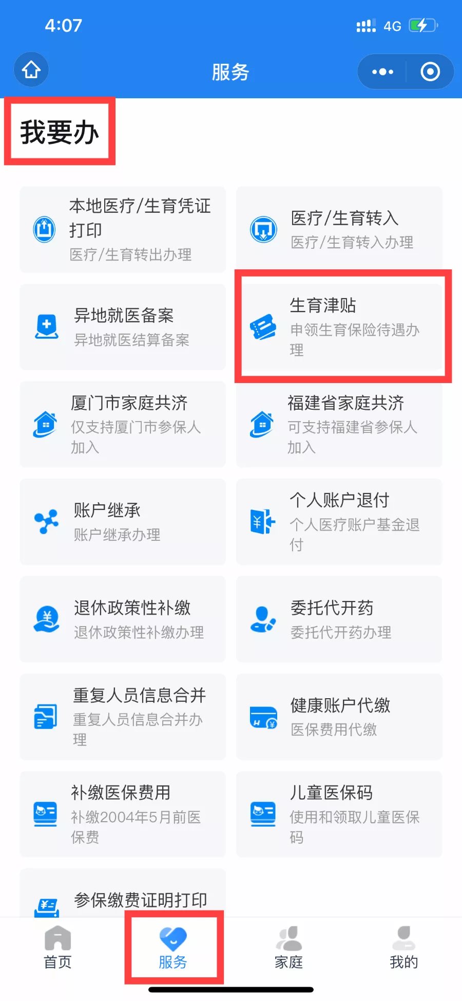 3.點(diǎn)擊“服務(wù)”模塊,找到“我要辦”——“生育津貼”,按提示操作即可;