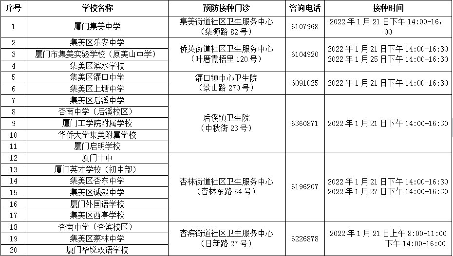 集美轄區(qū)各個社區(qū)衛(wèi)生服務中心預防接種門診(如下表格所示)。